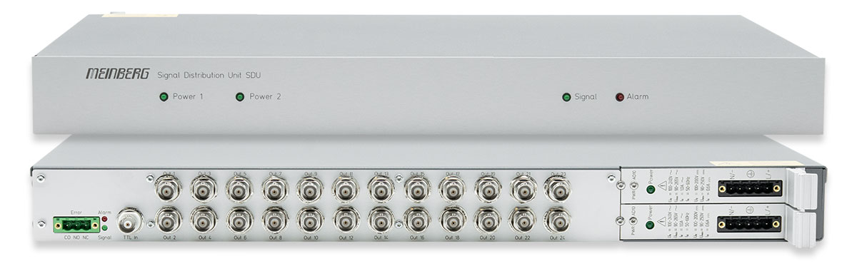 Simply expanding existing devices with additional outputs is no problem with the Meinberg SDU. The SDU base chassis in combination with one or optionally two distribution modules can distribute TTL-level signals (1PPS, IRIG DCLS or 10 MHz), optical fibre optic signals and/or modulated IRIG time codes (IRIG AM).